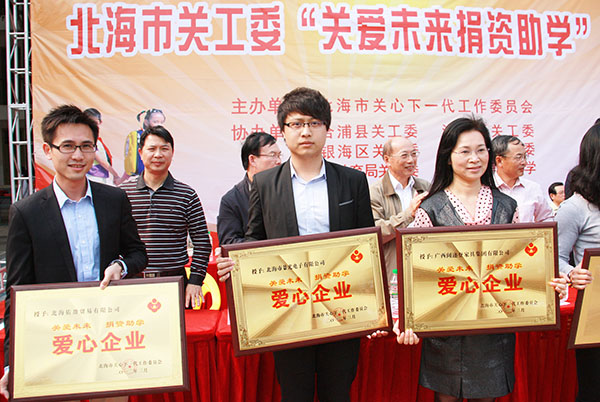 園區(qū)企業(yè)北海景光電子有限公司榮獲了“愛心企業(yè)”榮譽(yù)稱號,這是繼去年景光電子捐贈“女警護(hù)學(xué)崗”的又一獻(xiàn)愛心活動,同時是園區(qū)鼓勵企業(yè)積極響應(yīng)對“關(guān)愛未來捐資助學(xué)”的具體舉措。