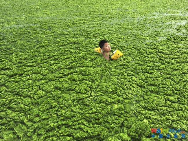 2009年6月16日,安徽省合肥市,一名漁夫捧著從巢湖取得的滿是藻類的湖水。