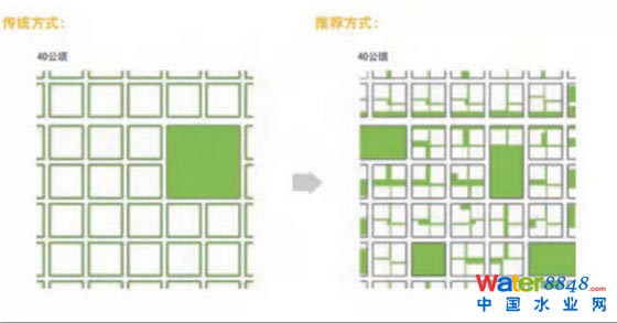 綠地等海綿體的兩種設(shè)計(jì)分布方式:傳統(tǒng)粗獷集中分布(左)和未來精細(xì)分散式分布(右)