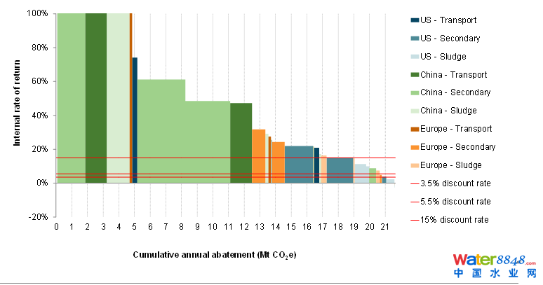 此外,對每項減排措施的內(nèi)部回報率的分析結(jié)果,表明三大地區(qū)能量效率投資存在高回報率。其中,經(jīng)證實污水輸送和二級處理改造措施最具投資吸引力。假設(shè)折現(xiàn)率為15%,碳價格為每噸CO2e30美元,僅依靠盈利性投資就可減少1900萬公噸CO2e的排放。