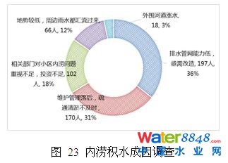 地塊內(nèi)(小區(qū)、單位等)積水問(wèn)題最主要原因的調(diào)查中,36%的人選擇了排水管網(wǎng)能力低,亟需改造31%的受訪者選擇了維護(hù)管理落后,疏通清淤不及時(shí)、選擇相關(guān)部門(mén)對(duì)小區(qū)內(nèi)澇問(wèn)題重視不足,投資不足、地勢(shì)較低,周邊雨水都匯流過(guò)來(lái)外圍河道漲水的受訪者占比分別為18%、12%3%。