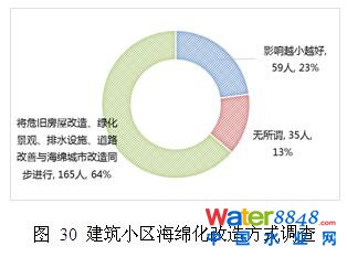 對(duì)于建筑小區(qū)的海綿城市改造,您更傾向于采取的方式中,23%的人要求影響越小越好、14%的人選擇無(wú)所謂、64%的人則任為可以將危舊房屋改造、綠化景觀、排水設(shè)施、道路改善與海綿城市改造同步進(jìn)行。