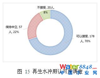 對(duì)再生水用于家庭沖廁的看法中,70%的人認(rèn)為可以接受         22%的人保持中立、僅有8%的人不接受。
