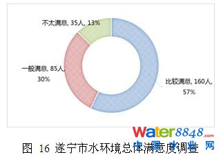 您對(duì)遂寧市河湖水系水環(huán)境總體情況是否滿意的問(wèn)題中,57%的人比較滿意、30%的人一般滿意13%的人不太滿意。