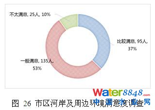 在問(wèn)及您對(duì)市區(qū)河岸及周邊環(huán)境是否滿意時(shí),37%的人認(rèn)為比較滿意、53%的人認(rèn)為一般滿意,僅有10%的人選擇不太滿意。