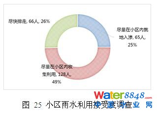 小區(qū)內(nèi)的雨水快排/利用問(wèn)題中,25%的受訪者支持盡量在小區(qū)內(nèi)就地入滲、49%的人支持盡量在小區(qū)內(nèi)收集利用25%的人則認(rèn)為應(yīng)盡快排走。