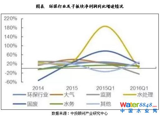 細(xì)分板塊中,固廢處理處置板塊在景氣上行階段,業(yè)績增幅高,2016年一季度業(yè)績穩(wěn)定增長,2015年和2016年一季度凈利潤增速為12%和24%。