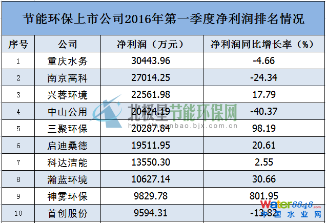 67家節(jié)能環(huán)保上市公司2016年第一季度凈利潤大排名