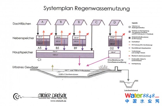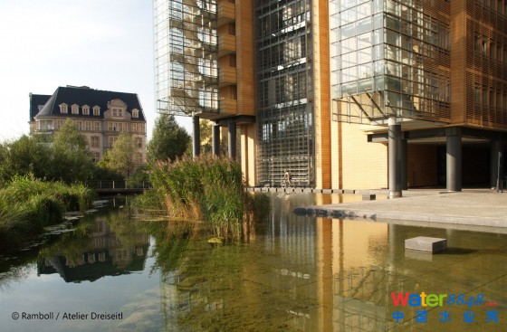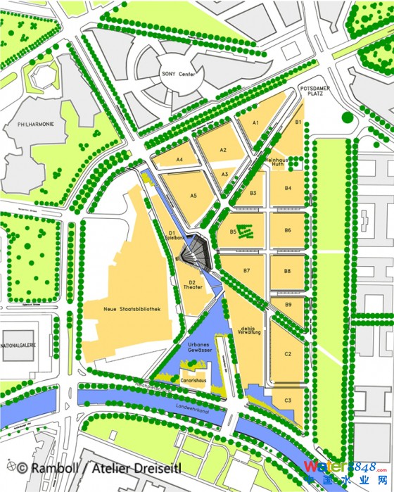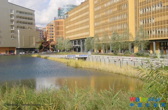 自柏林墻被推倒之后,赫伯特•德賴賽特爾即與一隊(duì)英德規(guī)劃團(tuán)隊(duì)一起參與了波茨坦廣場(chǎng)的設(shè)計(jì)。而水作為廣場(chǎng)開放空間主要元素的設(shè)計(jì)主題自初始階段即受到參議院和投資方的認(rèn)可。首先,以水作為設(shè)計(jì)主題所能夠營(yíng)造出的所有可能性捕獲了他們的想象力,其次這樣進(jìn)行設(shè)計(jì)滿足生態(tài)標(biāo)準(zhǔn)的潛力也激起了他們的興趣。以雨水作為如廁沖水和灌溉綠色空間的建議符合了這種需求。同時(shí),也可以采用地下水箱收集雨水、補(bǔ)給包含一個(gè)廣場(chǎng)北側(cè)的狹小湖體、廣場(chǎng)上大面積主體水體以及南部水面。另外,這樣的設(shè)計(jì)提供了建造階段不降低地下水位、且能夠適當(dāng)收集建筑體滑落雨水、填充附近運(yùn)河(Landwehrkanal)的可行性。