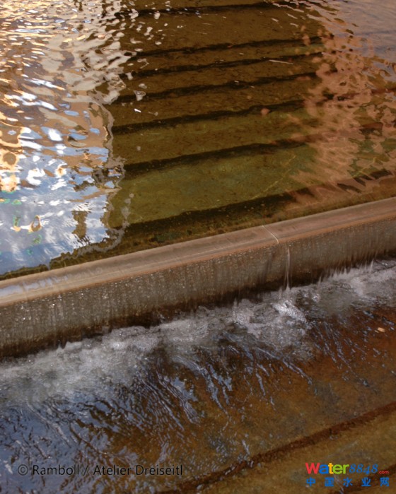 如果需要,也會(huì)使用工程過(guò)濾手段移除夏季水面上漂浮的藻類。在瑪琳•黛德麗廣場(chǎng)(Marlene-Dietrich-Platz)水體以復(fù)雜多變的形式流向廣場(chǎng)的最低點(diǎn)。水體自主體部分向流動(dòng)階梯滑行,在此處具有韻律感的波形結(jié)構(gòu)被創(chuàng)造出來(lái)。細(xì)部設(shè)計(jì)精確至厘米,由全比例的模型制作而成。之后毗鄰廣場(chǎng),水體從兩側(cè)緩緩移動(dòng),穿過(guò)線形水階,清晰地與建筑體形態(tài)呼應(yīng)。最終,水流從北部水體出發(fā),流入一個(gè)狹窄的水渠。該項(xiàng)目被設(shè)置了極其復(fù)雜的設(shè)計(jì)標(biāo)準(zhǔn),戴姆勒克萊斯勒集團(tuán)(DaimlerChrysler)的代表卡爾海因茨•博恩(Karlheinz Bohn)在波茨坦廣場(chǎng)開放之后恰當(dāng)?shù)刂赋隽?ldquo;正如這一設(shè)計(jì)概念帶給我們所有人迷人的景致,我們也能夠非常清楚地看到如果建造人工的大水面,則需要高能耗的技術(shù)干預(yù)和化學(xué)添加物的使用。”這一設(shè)計(jì)的結(jié)果能夠成為一個(gè)很好的說(shuō)服,因它的實(shí)施,水質(zhì)保持很好,對(duì)于降雨也具備一定的緩沖能力,同時(shí)能夠節(jié)約建筑物內(nèi)部的凈水消耗量。用設(shè)計(jì)語(yǔ)言來(lái)講,這一處具有城市水敏特征的設(shè)計(jì)賦予了波茨坦廣場(chǎng)開放空間獨(dú)特的魅力!
