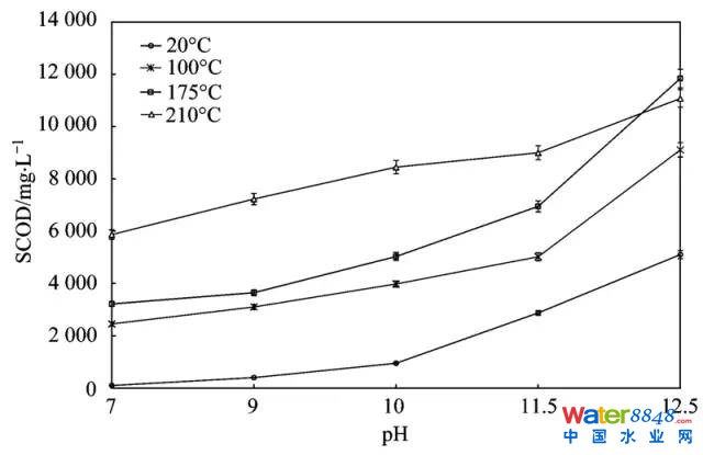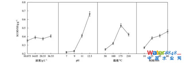 為了驗(yàn)證正交試驗(yàn)得出的單位污泥SCOD隨溫度和pH的變化趨勢(shì),進(jìn)行如下驗(yàn)證試驗(yàn):采用8 mol ˙L-1 NaOH分別將污泥pH調(diào)節(jié)為6.9±0.1、 9.0±0.1、 10±0.1、 11.5±0.1、 12.5±0.1,并穩(wěn)定5 min. 再將上述5種不同pH值污泥分別置于20、 100、 175及210℃處理60 min,冷卻后進(jìn)行相關(guān)分析,各做3組平行試驗(yàn). 1.3 分析方法