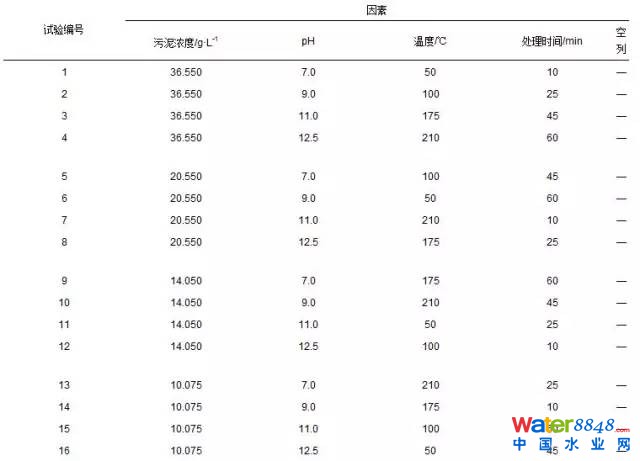 選擇污泥濃度、 pH、 溫度和處理時(shí)間4個(gè)因素,并取4個(gè)水平進(jìn)行熱堿處理正交試驗(yàn),選擇L9(45)正交表,正交試驗(yàn)設(shè)計(jì)表如表 1所示.