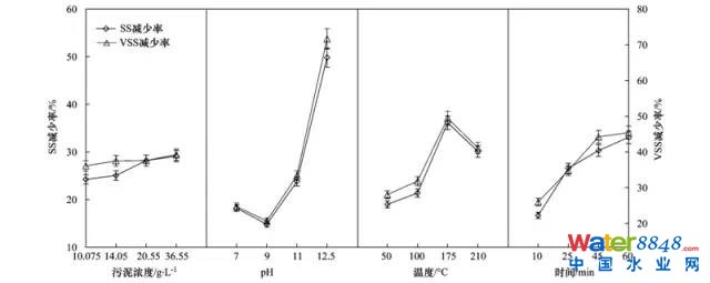 根據(jù)表 2中的試驗(yàn)結(jié)果,可以得到污泥SS、 VSS減少率隨4個(gè)因素的變化(圖 3). 從圖 3中可知,SS、 VSS減少率隨處理時(shí)間延長(zhǎng)和污泥濃度升高而升高,但隨污泥濃度的增加幅度小,這一變化規(guī)律與文獻(xiàn)一致. 此外,SS、 VSS減少率隨溫度的升高呈先升高后降低的趨勢(shì),此趨勢(shì)與文獻(xiàn)一致. 但是,SS、 VSS減少率卻隨pH的升高呈先降低后升高的趨勢(shì). 圖 3表明,在本試驗(yàn)條件下,4個(gè)因素對(duì)熱堿處理降低SS、 VSS的最佳組合條件為:污泥濃度36.55 g ˙L-1、 pH 12.5、 溫度175℃和處理時(shí)間60 min. 對(duì)比單位污泥SCOD和污泥濃度(SS和VSS)的變化(表 2、 圖 1和圖 3)可知,4個(gè)因素對(duì)3個(gè)參數(shù)的影響相似,這主要是由于污泥SCOD的釋放來(lái)源于污泥絮體和微生物細(xì)胞的破裂、 融胞所釋放的有機(jī)物,有機(jī)物釋放會(huì)使一部分不溶性物質(zhì)轉(zhuǎn)化為溶解性物質(zhì),從而降低污泥濃度.