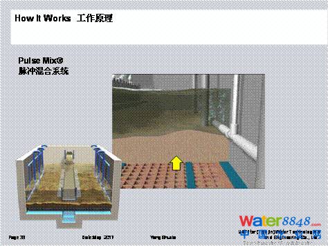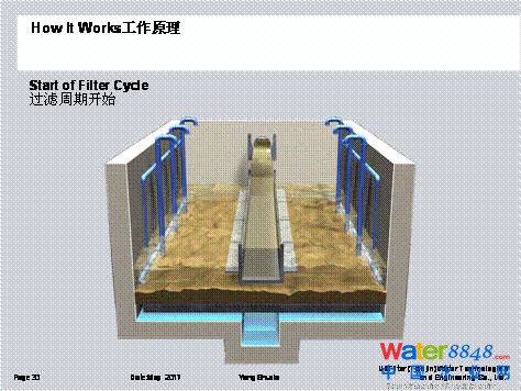 同時(shí)看一下濾池的結(jié)構(gòu),它實(shí)際上是一個(gè)非滿(mǎn)流的過(guò)濾,在承托層和清水層間有一層氣囊,在沙層上液位提升到一定的高度的時(shí)候,就會(huì)自動(dòng)啟動(dòng)脈沖攪拌,就是用清水壓著氣囊里面的氣自下而上的穿過(guò)承托層,穿過(guò)沙層,把沉積在沙層的污染物又反推到水層當(dāng)中,這樣把沙層上面的水層也作為一個(gè)納污層來(lái)利用從而保證正常過(guò)濾效果。
