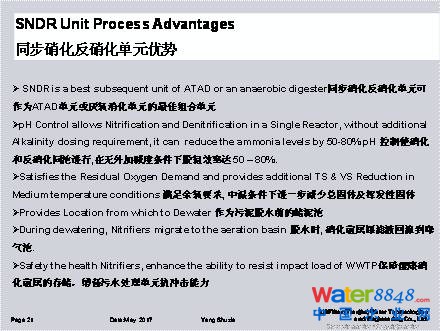 再回顧一下同步硝化反硝化單元的優(yōu)勢(shì),這個(gè)優(yōu)勢(shì)比較多,這我只列舉其中兩點(diǎn),其中一點(diǎn)就是對(duì)高濃度的氨氮有一個(gè)很好的降解作用,通過(guò)這個(gè)單元能夠把氨去除50-80%。在適當(dāng)補(bǔ)充堿度情況下可以達(dá)到100%氮去除的效果。另一點(diǎn)就是有10%左右的減容效果。
