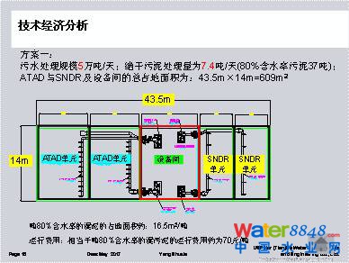 再來(lái)列舉一下國(guó)內(nèi)幾個(gè)典型的規(guī)模的一些參數(shù)。假設(shè)污水廠(chǎng)的基本處理規(guī)模是5萬(wàn)噸/d,含固率是20%的量,37噸的情況下,所用的面積是609平米,運(yùn)行費(fèi)用好氧消化+同步硝化反硝化70元/噸含水率80%的污泥。