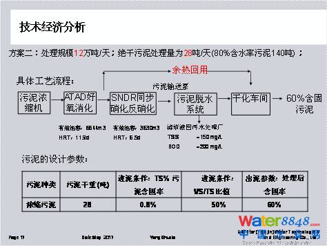 規(guī)模更大一些經(jīng)濟(jì)性更好一些。對(duì)于污泥規(guī)模為140/d80%含水率的污泥,它的處理的一個(gè)全流程,它的處理對(duì)象是針對(duì)剩余污泥,含固率只有0.8%的活性污泥,經(jīng)過(guò)全流程的處理,最后要達(dá)到60%含固率的泥,從泥量平衡上來(lái)說(shuō),我處理的對(duì)象是從3500噸,最后降到32噸,總體上達(dá)到99%以上的減容效果,它的一些經(jīng)濟(jì)參數(shù)是這樣的。運(yùn)行費(fèi)用是55元每噸80%含水率的污泥,這個(gè)全流程是從濃縮開(kāi)始,一直到預(yù)熱回收利用之后達(dá)到60%含固率的泥,總的運(yùn)行費(fèi)用是150元每噸80%含水率的污泥。而設(shè)備的參數(shù)供大家參考一下,具體項(xiàng)目參數(shù)還需具體分析。
