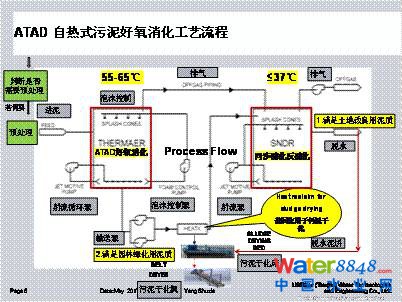 進(jìn)入到好氧消化單元的污泥為經(jīng)過(guò)濃縮的含固率為6.8%的濃縮污泥,ATAD工藝溫度范圍55-65ºC,含固率3.4%,PH8-8.5,通過(guò)同步硝化反硝化之后,不但對(duì)氨有了很好的去除效果,同時(shí)又有進(jìn)一步減容的效果。在ATAD+SNDR這兩個(gè)單元處理之后,可直接進(jìn)后續(xù)的濃縮脫水單元而沒(méi)有任何的臭味了,僅是一種泥煤的味道(因?yàn)榻^大部分引起臭味的揮發(fā)性有機(jī)物均已降解消化),脫水后的污泥國(guó)外是作為土壤的改良劑來(lái)利用的,在國(guó)內(nèi),脫水后污泥在重金屬不超標(biāo)前提下,其實(shí)也已滿(mǎn)足土地改良用泥質(zhì)標(biāo)準(zhǔn)要求。如果說(shuō)要滿(mǎn)足更高的一個(gè)處理標(biāo)準(zhǔn),比如說(shuō)園林綠化的需求,那我們還要對(duì)這個(gè)脫水污泥進(jìn)行進(jìn)一步的干化,從ATAD自熱式好氧消化單元因其溫度處于55-65ºC的高溫階段,可從其中提取廢熱用于脫水之后泥餅的進(jìn)一步干化。采用熱泵來(lái)回收熱量,在基本上不太增加運(yùn)行費(fèi)用基礎(chǔ)上就能夠取得含固率60%的污泥,同樣在重金屬不超標(biāo)的前提下,滿(mǎn)足園林綠化的需求。
