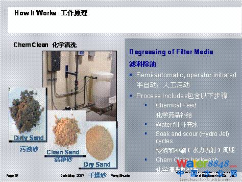 當(dāng)污染物黏附在沙層上用正常反洗沖洗不干凈或有油污的時(shí)候,系統(tǒng)還配有化學(xué)清洗系統(tǒng);瘜W(xué)清洗的過(guò)程能把粘附性強(qiáng)比較臟的污染物,通過(guò)反復(fù)浸泡在濃度為12.5%的次氯酸鈉溶液中而使沙層徹底恢復(fù)潔凈。通過(guò)化學(xué)清洗系統(tǒng)清洗后的沙子恢復(fù)的跟新沙一樣。