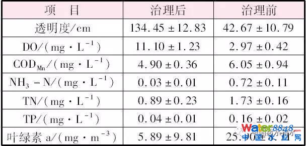 比對改造前后水質(zhì)情況,發(fā)現(xiàn)改造后水體透明度和DO指標(biāo)大幅提高,平均增幅分別達215.09%和273.73%,而CODMn、氨氮、總氮、總磷和葉綠素a等指標(biāo)均有顯著下降,平均降幅分別達30.15%、95.8%、48.6%、75.0%和77.26%。從改造前高于地表水Ⅴ類水標(biāo)準(zhǔn)下降到低于地表水Ⅲ類水標(biāo)準(zhǔn),水體透明度達1.3 m。綜上,通過對各項主要水質(zhì)指標(biāo)的監(jiān)測分析表明,綜合治理技術(shù)對水體中氮、磷等富營養(yǎng)化物質(zhì)具有較強的去除能力,水質(zhì)顯著改善。