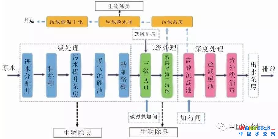 碧水再生水廠主處理工藝采用三級(jí)AO工藝,深度處理采用高效沉淀+超濾+紫外消毒工藝,出水中8萬(wàn)m3/d作為再生水回用,另外10萬(wàn)m3/d作為河道補(bǔ)給水源。污泥處理采用低溫風(fēng)冷干化,污泥處理量為200t/d(含水率80%)。另外,該廠采用生物除臭技術(shù),最大程度控制臭氣排放,符合《城鎮(zhèn)污水處理廠污染物排放標(biāo)準(zhǔn)》(GB18918-2002)中大氣污染物排放的一級(jí)標(biāo)準(zhǔn)。工藝流程如圖2所示。
