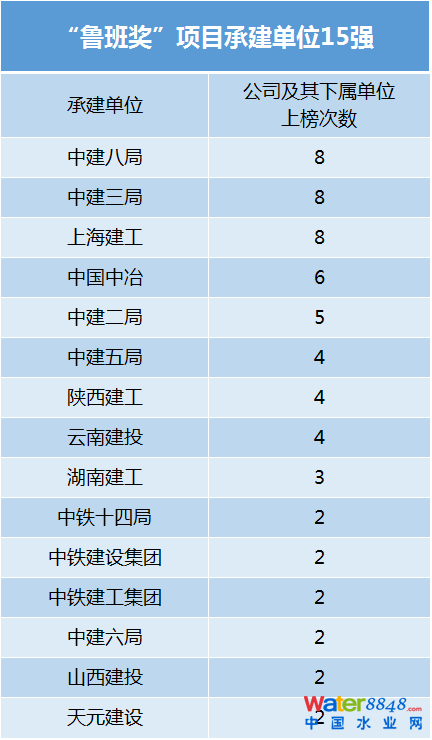通哥對(duì)入選“魯班獎(jiǎng)”項(xiàng)目的承建和參建單位上榜次數(shù)最多的前15強(qiáng)做了統(tǒng)計(jì),看看都有哪些單位: