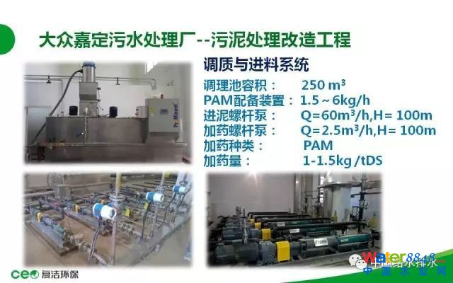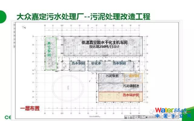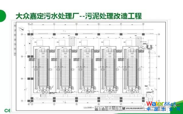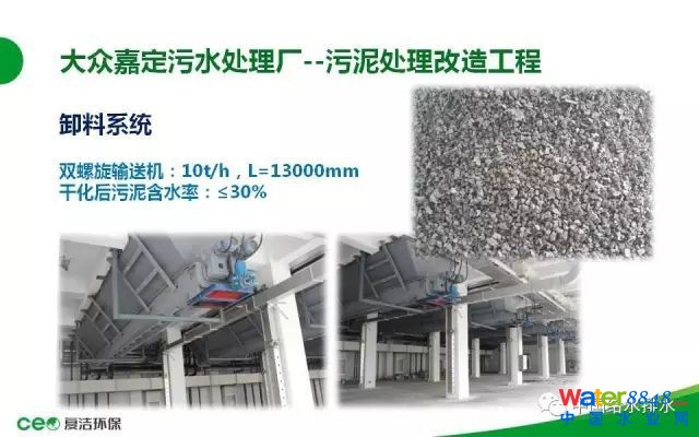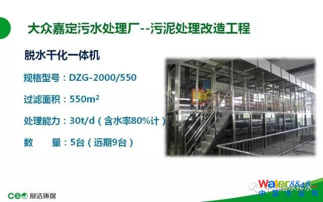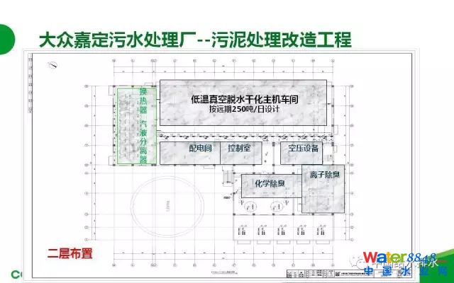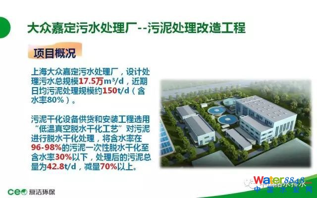 下面我介紹一個(gè)近期的工程案例。大眾嘉定污水處理廠:這是上海大眾嘉定BOT運(yùn)行的污水處理廠,污水廠的設(shè)計(jì)污水處理規(guī)模是17.5萬噸,分三期建設(shè),現(xiàn)在三期已經(jīng)建設(shè)完成了。近期的污泥處理規(guī)模是150噸,就是17.5萬噸的水,150噸的泥,污泥干化設(shè)備的供貨安裝,這是一個(gè)標(biāo)段,采用低溫真空脫水干化工藝,原泥96-98%一次性脫水干化至含水率30%以下,處理以后的污泥總量理論計(jì)算是42.8噸,減量71%左右。