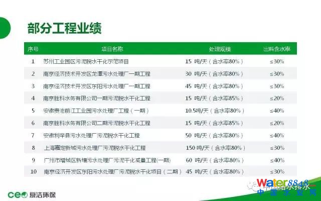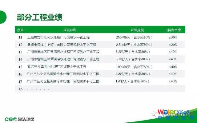 時(shí)間關(guān)系后面簡單一點(diǎn),就是我們的技術(shù)是2011年開始工業(yè)化投產(chǎn),2012年、2013年的六七年時(shí)間里,我們承接了包括南京、安徽、上海、廣州等地十幾個(gè)項(xiàng)目,目前在運(yùn)行的項(xiàng)目也有十幾個(gè)。這是蘇州工業(yè)園區(qū)的示范工程(10噸每天);南京開發(fā)區(qū)龍?zhí)段鬯幚韽S(30噸每天);南京經(jīng)濟(jì)開發(fā)區(qū)東陽污水處理廠(50噸每天),這是一期,二期也是我們做的,也是50噸的;勝科水務(wù)35噸,要求含固率達(dá)到20%以下;這是上海嘉定另外一個(gè)項(xiàng)目,這個(gè)項(xiàng)目規(guī)模設(shè)計(jì)150噸,這是去年年初已經(jīng)停產(chǎn)了,嘉定大政今年年初到現(xiàn)在運(yùn)行5個(gè)月左右;這是上海的一個(gè)工業(yè)項(xiàng)目,晟碟半導(dǎo)體一個(gè)做U盤的單位的危廢處理項(xiàng)目。其他的時(shí)間有限,不一一介紹了。這是我們二維碼還有聯(lián)系方式,如果有交流的各位領(lǐng)導(dǎo)專家同行可以多多聯(lián)系。