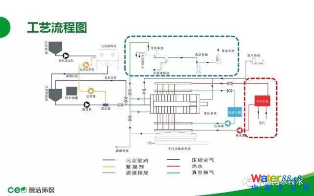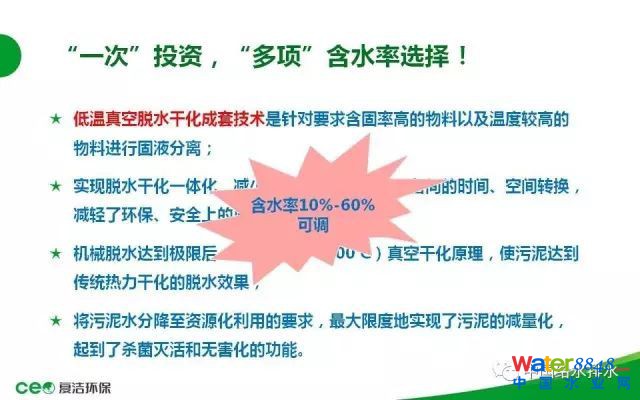 再增加一個(gè)系統(tǒng)就是真空系統(tǒng),污泥中的水分常壓下需要一百度以上才能沸騰汽化。熱源只有80度左右,所以提供一個(gè)低壓的環(huán)境,就是增加一個(gè)真空環(huán)境。這個(gè)技術(shù)集合脫水和干化一體化,從源頭進(jìn)行減量,避免污泥的大量外運(yùn),包括降低了一些外運(yùn)過程中的環(huán)境污染等等。那我們也是采用模塊化的設(shè)計(jì),根據(jù)項(xiàng)目建設(shè)的規(guī)模包括進(jìn)度,一次性設(shè)計(jì)、靈活分期建設(shè),后面有一些案例可以體現(xiàn)這一點(diǎn)。因?yàn)樗撍苫癁橐惑w,直接運(yùn)行成本更加低廉,;只添加少量常規(guī)的絮凝劑,藥劑成本低。熱源,我們采用熱水作為熱源,在項(xiàng)目建設(shè)階段,可以多途徑的去選擇熱源的組成,可以選擇低品位的余熱蒸汽,煙道氣,或者配置天然氣的鍋爐等等。
