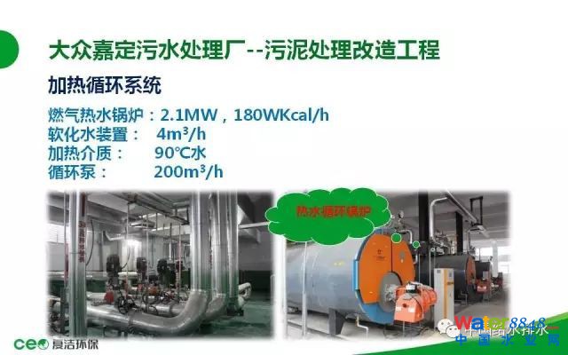 這個(gè)流程圖是典型的工藝流程圖。左側(cè)是污泥板塊,那么左上節(jié)是一個(gè)污泥濃縮設(shè)備。現(xiàn)在污水處理廠大多數(shù)都有重力氣濃縮,沒有重力濃縮的話,加一個(gè)設(shè)備,達(dá)到污泥預(yù)濃縮。右側(cè)我們在傳統(tǒng)的工藝上增加了一個(gè)熱源系統(tǒng),工藝圖中寫的是蒸汽,在項(xiàng)目過程中,所需要的熱源是80-90度的熱水,如果項(xiàng)目中有蒸汽,由蒸汽加熱熱水;如果沒有蒸汽,我們是配一些比如說電鍋爐、天然氣鍋爐,包括利用余熱蒸汽,兩三公斤低品位蒸汽,在這個(gè)過程中也可以使用。