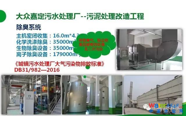 燃?xì)鉄崴仩t,加熱介質(zhì)90度熱水。真空脫濕系統(tǒng),配置真空泵、冷凝器、冷卻水。這個(gè)是設(shè)計(jì)院總體考慮,用園區(qū)再生水作為冷卻水。這是一個(gè)雙軸螺旋輸送機(jī),干化后污泥含水率小于30%。除臭設(shè)備簡單說兩句,因?yàn)樵谏虾J?016年3月份出臺了一個(gè)地標(biāo)要求,地標(biāo)要求比惡臭污染物的控制要高的多,所以配置了化學(xué)除臭,加生物除臭,這是一個(gè)收集加排放,同時(shí)又配置離子送風(fēng)設(shè)備。所有的除氣和粉塵收集,經(jīng)處理達(dá)標(biāo)后排放。