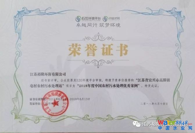當(dāng)天下午 “2018年度中國村鎮(zhèn)污水處理優(yōu)秀案例評(píng)選”頒獎(jiǎng)典禮隆重舉行,江蘇裕隆環(huán)保有限公司以“亳村農(nóng)村污水處理站”榮獲“2018年度中國農(nóng)村污水處理優(yōu)秀案例”,我公司將全面貫徹十九大精神,肩負(fù)時(shí)代的新使命,為祖國的青山綠水奉獻(xiàn)自己的綿薄之力。