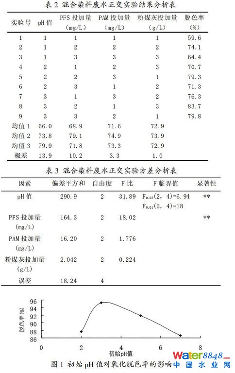 方差分析結(jié)果表明,A、B都為極顯著,由于沒有交互作用,故為加性模型,即A、B的好水平組合表現(xiàn)一定好。從表2極差分析中可看出,各因素對(duì)脫色率的影響順序?yàn)椋簆H值>PFS投加量>PAM投加量>粉煤灰投加量。從平均值上看,A以A3最好,B以B2最好,C以C2最好,D以D2最好。又因D水平1、2相差很小,由此我們可判斷正交表中混凝的最佳組合是A3B2C2D1,即混合染料廢水混凝最佳條件為:pH值7,PFS投加量1000mg/L,PAM投加量8mg/L,粉煤灰投加量2g/L。以此最佳條件做三次重復(fù)實(shí)驗(yàn),所得平均脫色率是83.9%。