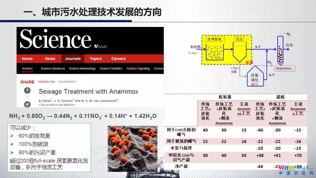 在本世紀(jì)初,污水處理領(lǐng)域有兩個(gè)非常著名的發(fā)現(xiàn):第一個(gè)是厭氧氨氧化,第二個(gè)是好氧顆粒污泥,這給污水處理的發(fā)展帶來(lái)非常大的變數(shù)。好氧顆粒污泥和厭氧氨氧化實(shí)際已經(jīng)有一二十年的歷史,但是一直沒(méi)有引起足夠的關(guān)注。對(duì)于厭氧氨氧化的研究,荷蘭代爾夫特理工大學(xué)的Mark教授在《Science》上發(fā)表了一篇文章,認(rèn)為厭氧氨氧化可以使污水處理廠達(dá)到凈的產(chǎn)能,這就給污水處理廠下一步的發(fā)展指明了一條道路。