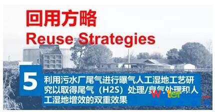 第五個(gè)是利用污水處理廠尾氣進(jìn)行曝氣人工濕地研究。污水處理廠產(chǎn)生臭氣,把這些臭氣進(jìn)行收集,收集后用作鋁污泥型人工濕地的曝氣氣源。我們研究很多,把收集的污水處理廠臭氣從底部通入鋁污泥型人工濕地系統(tǒng),鋁污泥可以吸附臭氣中的硫化氫,同時(shí)給濕地做一點(diǎn)鼓氣作用,促進(jìn)濕地效果,同時(shí)除臭,一舉兩得。