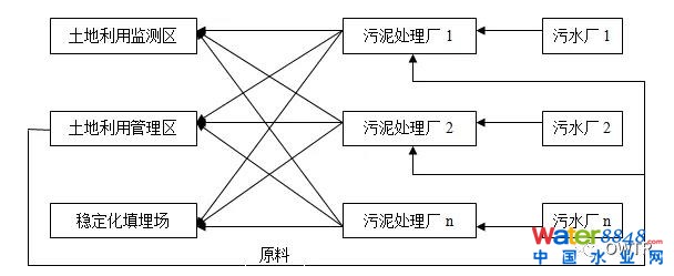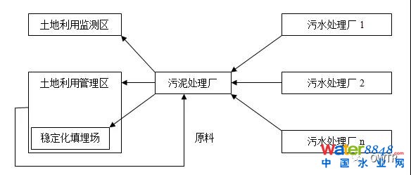 污泥處理廠是污泥處理系統(tǒng)的樞紐,承擔著對污泥進行無害化、穩(wěn)定化處理的與污水處理廠的對應(yīng)關(guān)系可以是一對一(分散處理),也可以是一對多(集中處理),好氧發(fā)酵所需的原料來源于土地利用管理區(qū),發(fā)酵產(chǎn)物根據(jù)檢測指標去往土地利用管理區(qū)、土地利用監(jiān)測區(qū)、穩(wěn)定化填埋場。