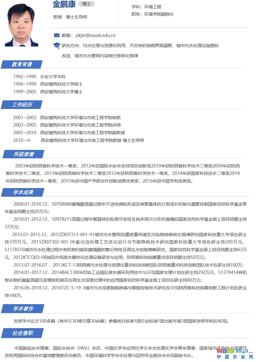 金鵬康,西安建筑科技大學(xué)教授,國(guó)家新世紀(jì)優(yōu)秀人才,陜西省污水處理與資源化重點(diǎn)科技創(chuàng)新團(tuán)隊(duì)帶頭人, 中國(guó)化學(xué)會(huì)應(yīng)用化學(xué)分會(huì)水處理化學(xué)會(huì)青年理事及中國(guó)脫鹽協(xié)會(huì)理事