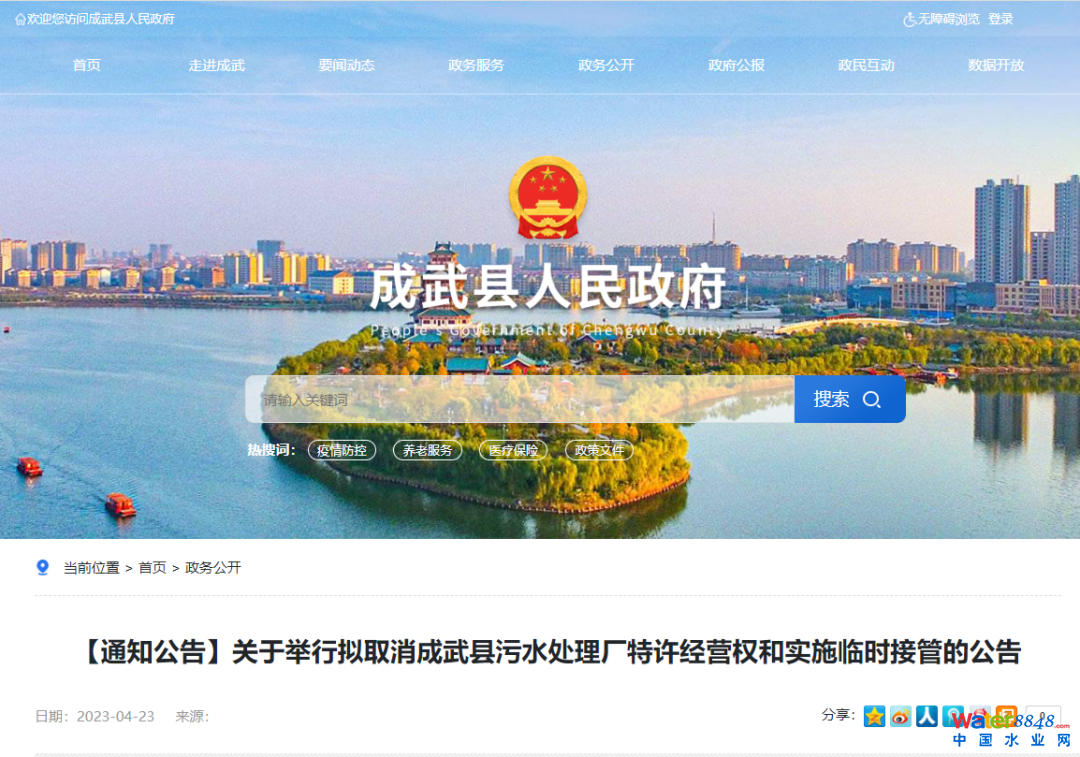 據(jù)中國水網(wǎng)獲悉,近日,成武縣人民政府發(fā)布《關(guān)于舉行擬取消成武縣污水處理廠特許經(jīng)營權(quán)和實施臨時接管的公告》。