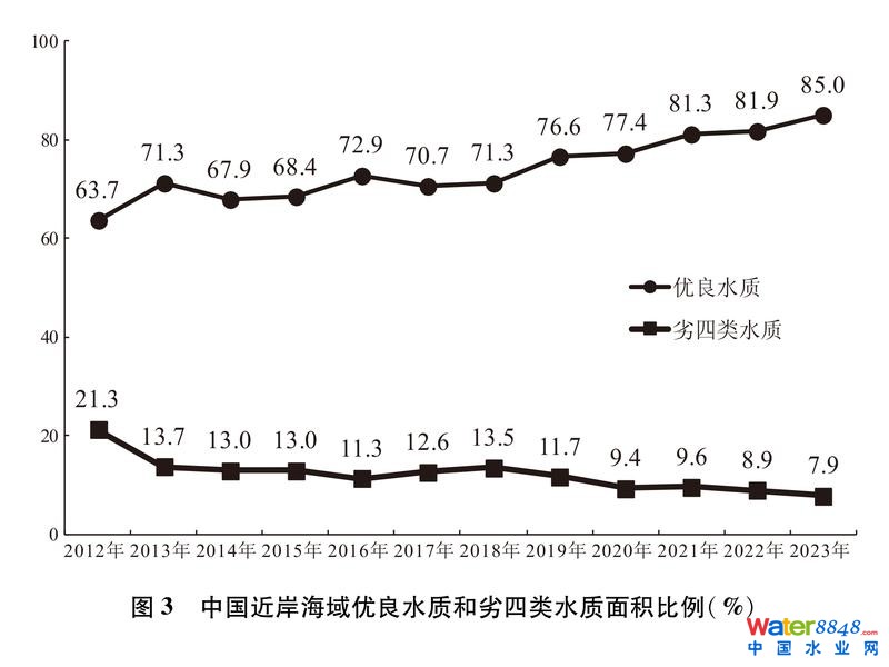 通過深入推進(jìn)重點(diǎn)海域綜合治理、陸海污染協(xié)同防治,持續(xù)建設(shè)美麗海灣,中國(guó)近岸海域水質(zhì)總體改善,2023年優(yōu)良水質(zhì)面積比例較2012年高出21.3個(gè)百分點(diǎn)。