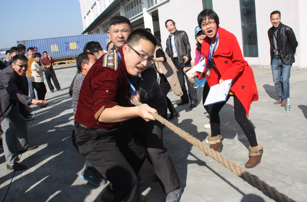 下午,一場別開生面的拔河比賽將活動推向小高潮。拔河比賽以促進企業(yè)交流為宗旨,豐富職工體育活動為目的,為企業(yè)搭建展現(xiàn)集體風采的舞臺,從而發(fā)揚團隊精神,增強凝聚力。此次比賽園區(qū)企業(yè)積極響應,共有11個企業(yè)組隊參加,特別是有些企業(yè)為了參賽,臨時停工,比賽結(jié)束后回單位繼續(xù)生產(chǎn),體現(xiàn)了園區(qū)大家庭的凝聚力。每支參賽隊伍共15人,其中男生10人,女生5人,實行淘汰制晉級方式。當比賽哨聲響起,各參賽隊員們口中一起高呼“一二,一二”,雙手緊握長繩,憋足勁拼命往后拉,拉拉隊在旁助陣加油,恨不得抓起繩子跟隊員們一起努力,各種加油聲、吶喊聲此起彼伏,回響至整個園區(qū)。經(jīng)過激烈較量,最終冠捷科技獲得冠軍,瑞達物業(yè)獲得亞軍。
